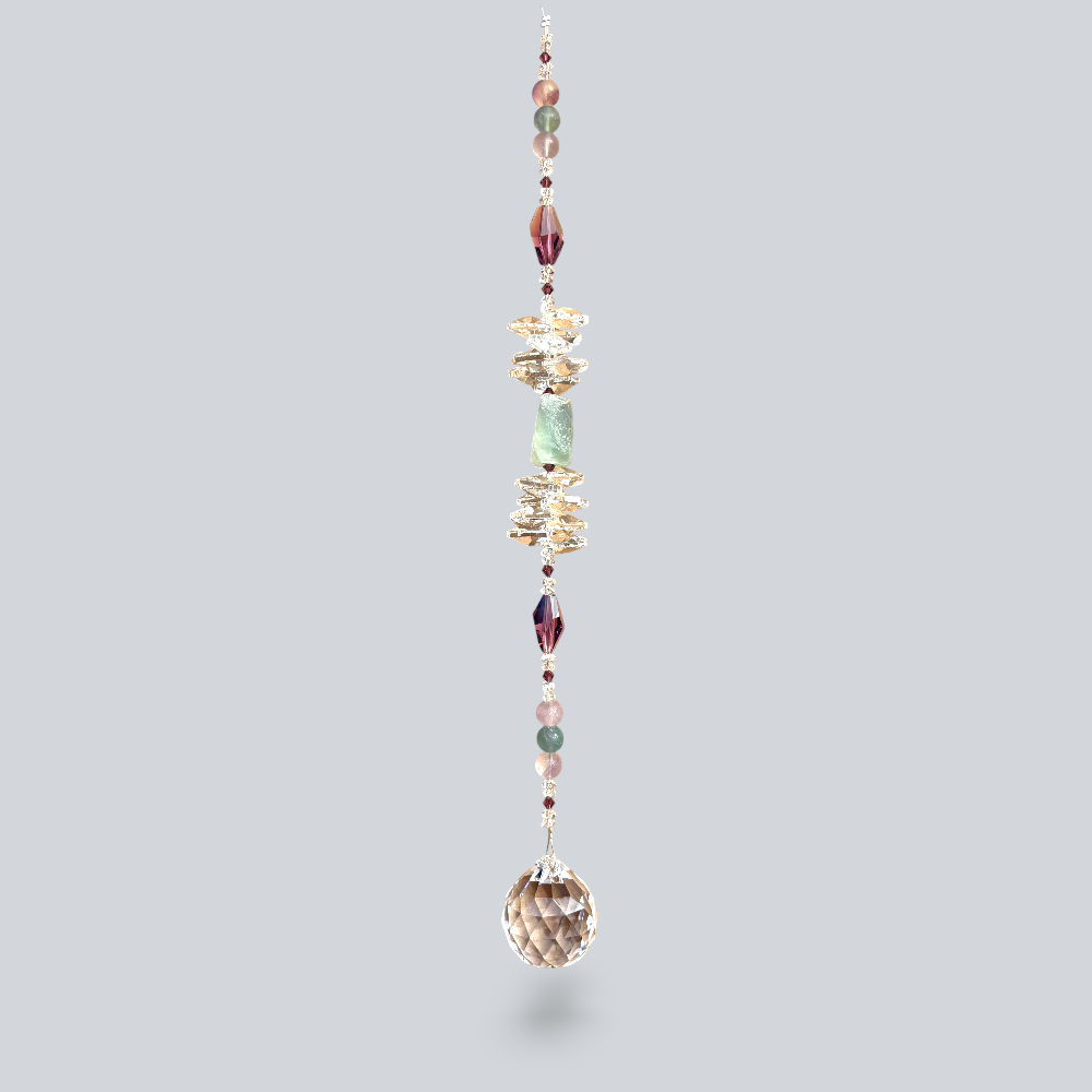 Hand-strung rainbow crystal with fluorite natural stone that responds to sunlight, casting beautiful reflections into your space. Each piece comes with a velvet pouch and suction cup for easy window display.