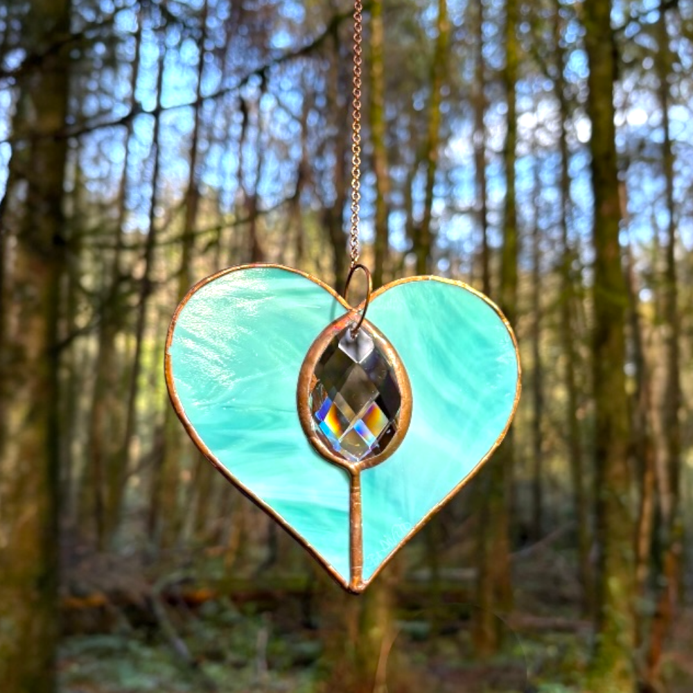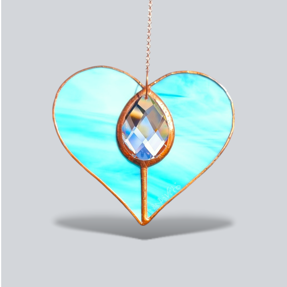 Our signature Lily Heart is a striking Tiffany Copper Foiled pendant which features a full lead crystal that catch light beautifully. Perfect for collectors or as a lasting, luminous gift.