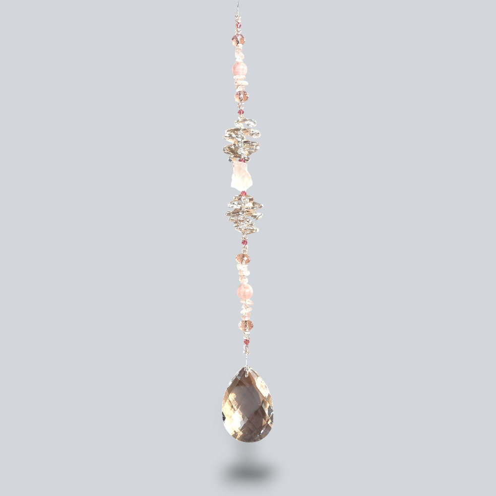 Hand-strung rainbow crystal with natural rose quartz stone that responds to sunlight, casting beautiful reflections into your space. Each piece comes with a velvet pouch and suction cup for easy window display.